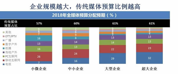 為什么?首先說說電視。企業(yè)規(guī)模越大,選擇電視媒體和傳統(tǒng)媒體的預算比例就越高。這并不是偶然的,因為所有的大型企業(yè)它們都是建立在工業(yè)生產的規(guī)?;a的效率上,只有大的規(guī)模,才可以獲得更高的利潤才可以形成發(fā)展空間。所以當需要大規(guī)模生產基礎上的營銷活動,勢必要大規(guī)模的消費者觸達,而這種規(guī)模性的營銷——定時的爆發(fā)點的、有傳播勢能的營銷,其實是在以電視為首的這樣傳統(tǒng)媒體上予以形成的。所以我們會看企業(yè)規(guī)模越大,在傳統(tǒng)媒體上的預算是越高的。