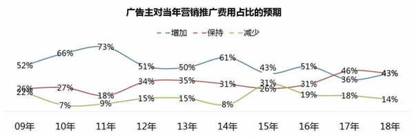 根據調查數據顯示,在過去這些年起起伏伏的趨勢中,去年和往年不太一樣,保持投入的廣告主的比例最高,達到46%,今年增加和持平的廣告主比例達到相對持平的狀態(tài)為43%,也就是希望增加投入以及希望減少投入的廣告主的比例基本上是一致的。