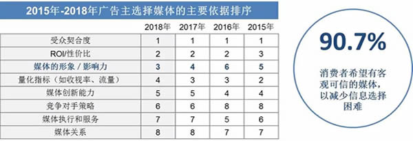 首先就是媒體的品牌化,也可以說是媒體可信度的兌現,無論什么方式,其實它是可以去兌現的維度。從廣告主調研的結果看,媒體的形象/影響力在15年的時候排在第5位5,后來下降成6,去年回到4,那么今年更是回到了3意味著什么?當我們的信息或者非常碎片化的時候,以及所有的信息過載的這個狀態(tài)下的時候,能不能給我靠譜的信息變成了重要的事情,90%以上的消費者希望有可信的媒體減少信息選擇困難。