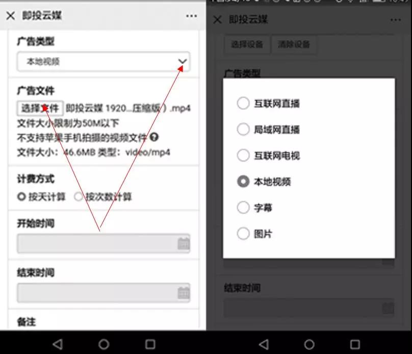 打開“廣告類型”下拉列表,點(diǎn)選所投廣告類型,點(diǎn)擊“選擇文件”按鈕打開手機(jī)文件選擇對應(yīng)類型素材。