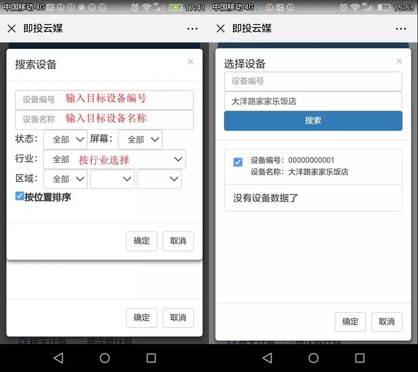 點(diǎn)擊“選擇設(shè)備”打開投放設(shè)備選擇窗口,輸入設(shè)備名稱/編號搜索目標(biāo)設(shè)備,或按照設(shè)備所處的狀態(tài)、行業(yè)、區(qū)域等條件設(shè)置搜索目標(biāo)設(shè)備,或直接搜索列表設(shè)備,勾選目標(biāo)投放設(shè)備,單擊“確定”。