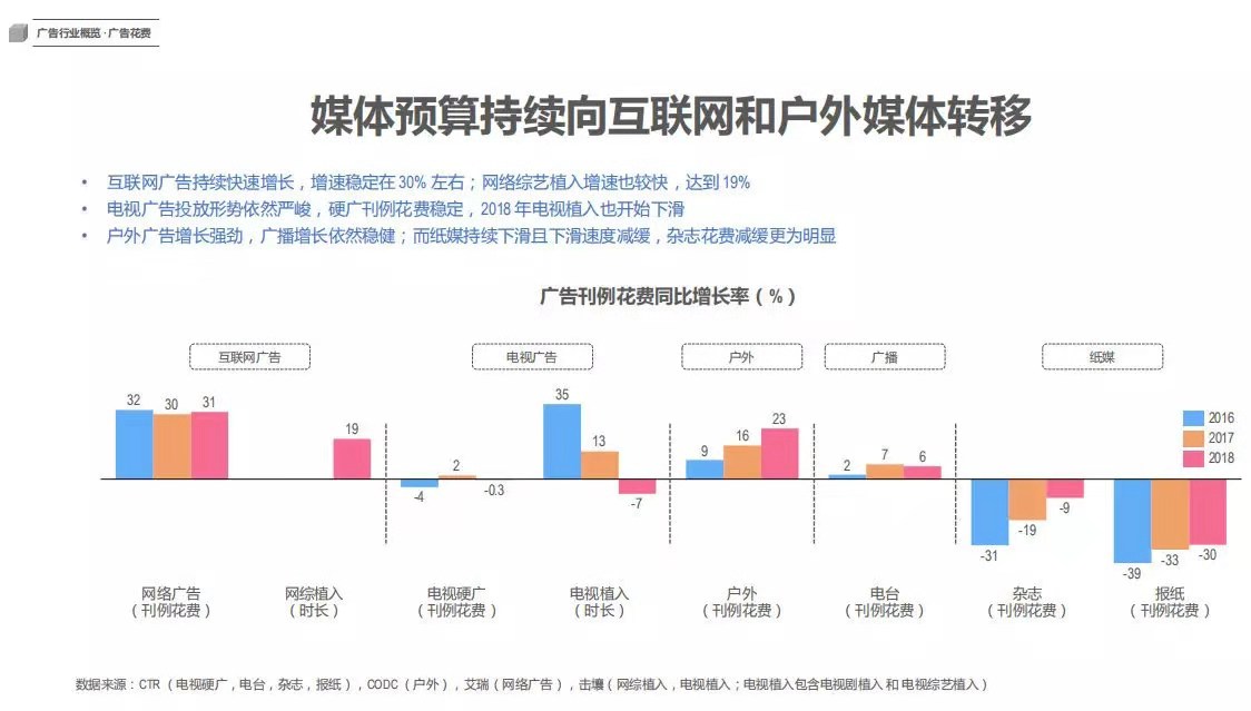 現(xiàn)如今,用戶觸媒渠道碎片化、信息的流動加速,這不僅提升了用戶的信息辨識能力,同時減弱了互聯(lián)網(wǎng)廣告的轉(zhuǎn)化率。據(jù)數(shù)據(jù)分析顯示,媒體的廣告預(yù)算正持續(xù)向互聯(lián)網(wǎng)和戶外媒體轉(zhuǎn)移。其中,戶外廣告增長勢頭尤為強(qiáng)勁。